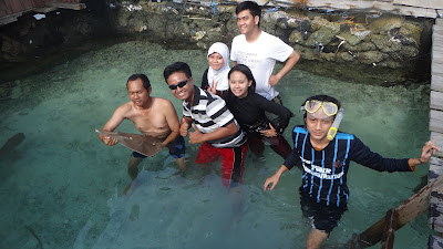 5 menit kemudian, kapal menepi. Perjalanan tercepat yang pernah kami lalui. Ahhaa. Kita mampir di Wisma Apung. Dimana ada penangkaran Hiu dan ikan Pari di sini. Dan Cuma orang orang yang berani ada diantara hiu aja yang berani turun ke sini. Sisanya numpang eksis lagi aja :-D
